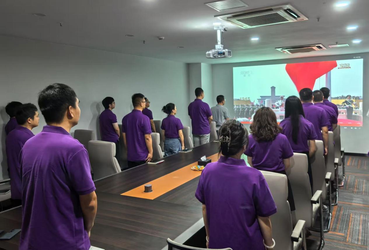 随着《义勇军进行曲》前奏响起,在党支部书记屈东明同志的带领下,清电易集团全体员工肃然起立,面向画面中的五星红旗,齐声高唱中华人民共和国国歌。随后,盛大的阅兵式正式开始。屏幕上,受阅部队军容严整、气势如虹,新型武器装备依次亮相,充分展现了国之重器的威严与现代化国防力量的磅礴气势;官兵们铿锵有力的步伐、坚毅果敢的眼神,完美诠释了中国军人的英勇无畏和忠诚担当。这一幕幕壮观的场景,令在场所有清电易人心潮澎湃、热血沸腾,无不为人民军队的强盛和祖国的繁荣昌盛感到无比自豪与骄傲。